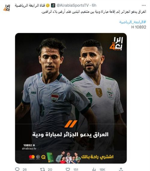 جاء ذلك وفقا لِما أوردته القناة الرياضية العراقية الرابعة، عِلما أن منتخب هذا البلد يستعدّ لِخوض تصفيات كأس العالم 2026، التي تنطلق بِقارة آسيا في أكتوبر المقبل، وأيضا نهائيات كأس أمم آسيا، المُبرمجة بِقطر ما بين جانفي وفيفري 2024.