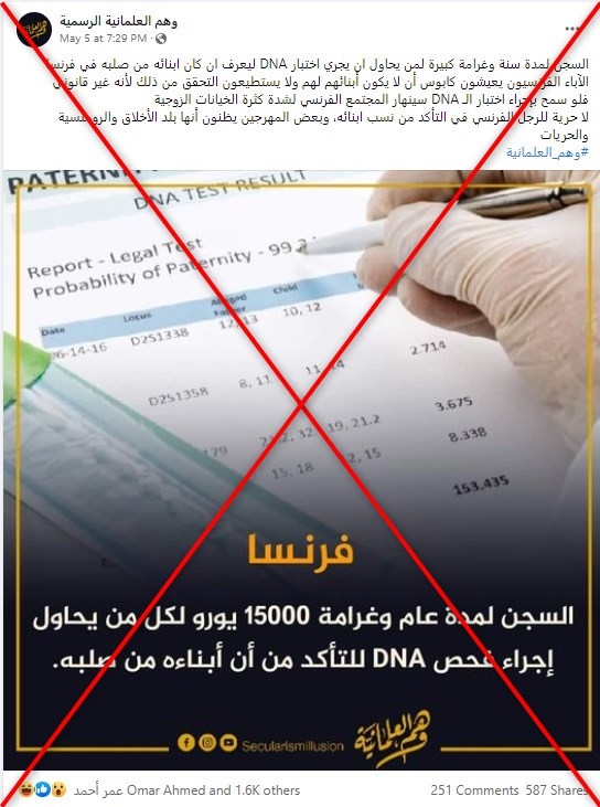تنتشر عبر مواقع التواصل الاجتماعي وعبر صفحات على الإنترنت، أخبار يدّعي ناشروها أنّ “فرنسا تجرّم كلّ أب يحاول أن يجري تحليل حمض نووي لمعرفة إن كان أبناؤه من صلبه”.