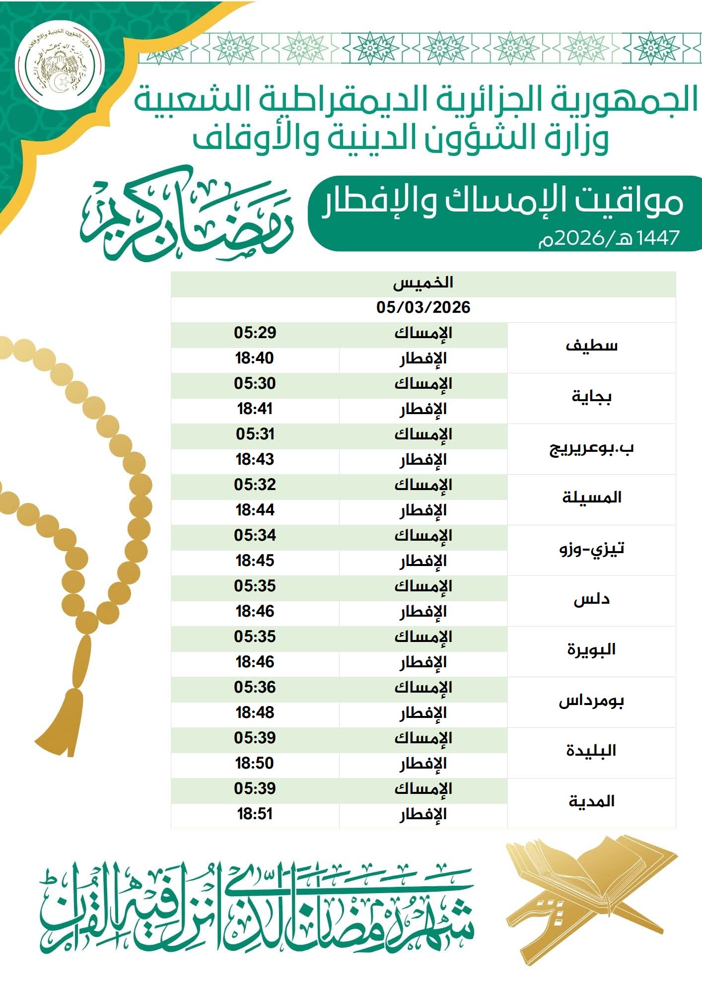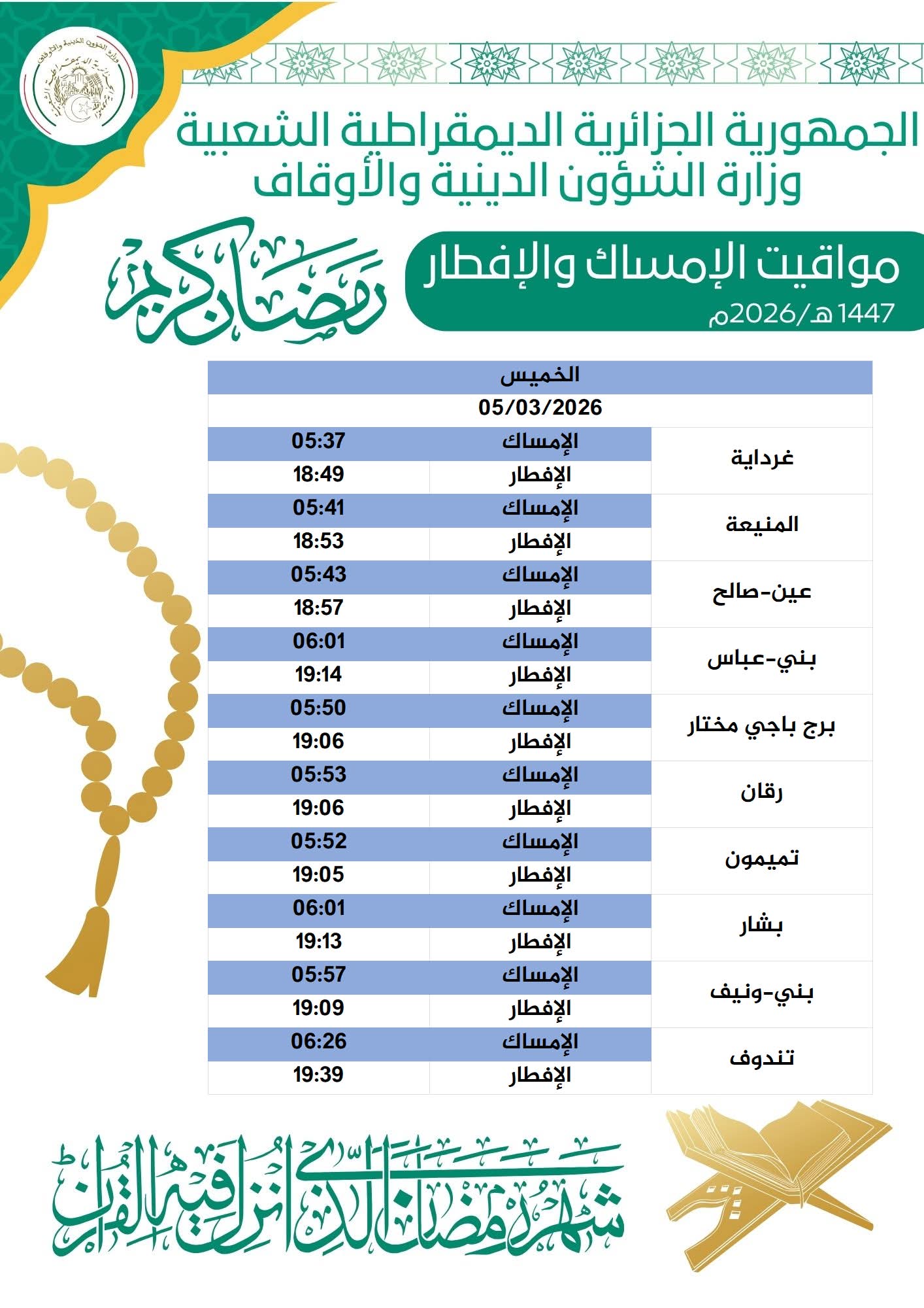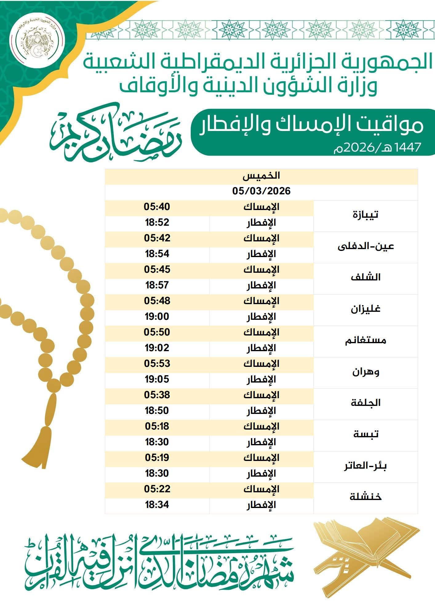 نشرت وزارة الشؤون الدينية والأوقاف مساء الأربعاء، مواقيت الإمساك والإفطار، لجميع ولايات الوطن. في يوم الخميس 15 رمضان 1447ه.