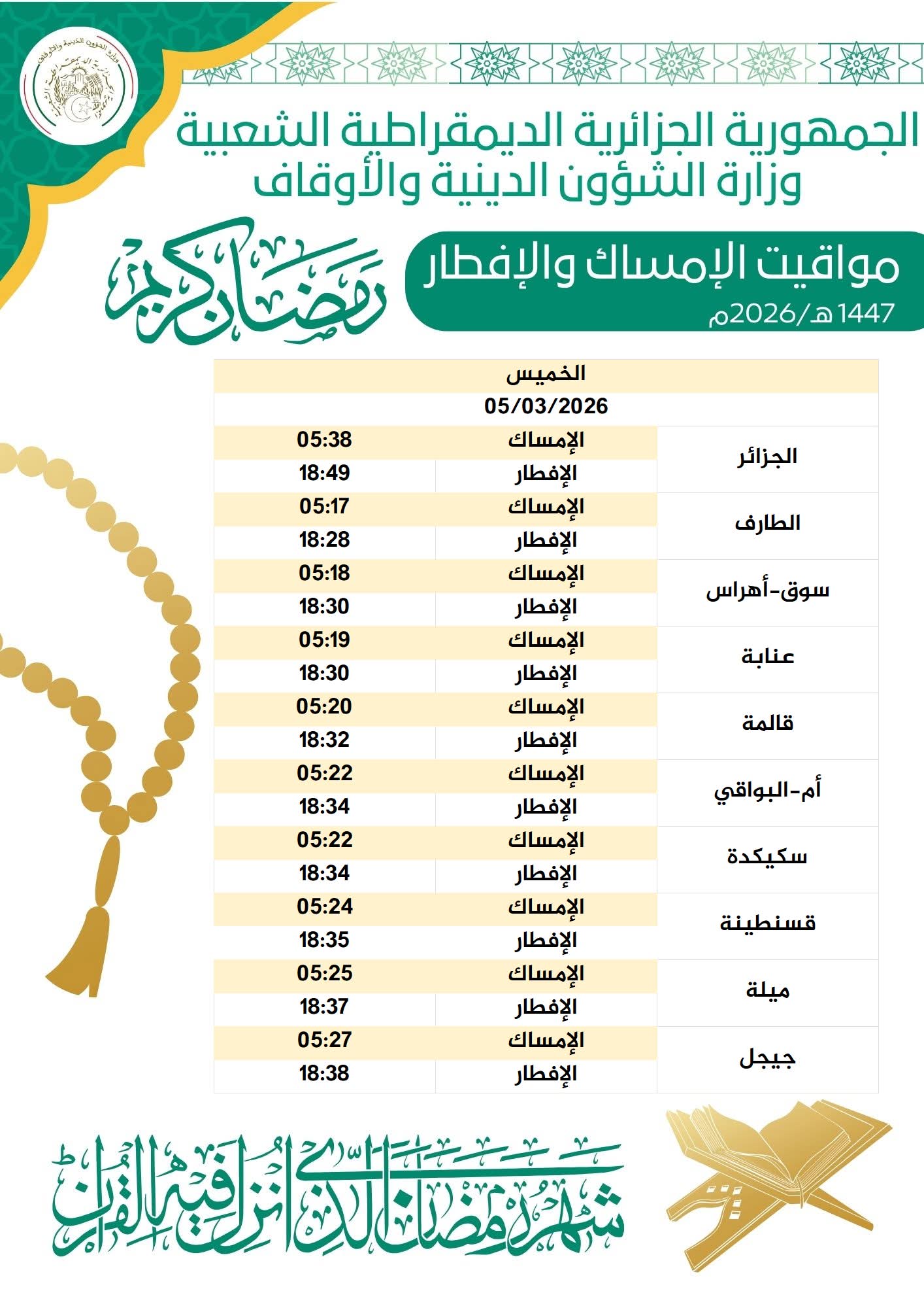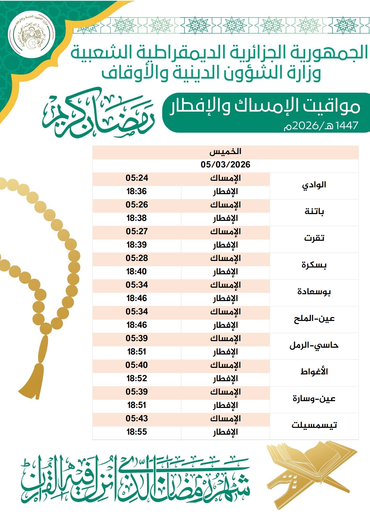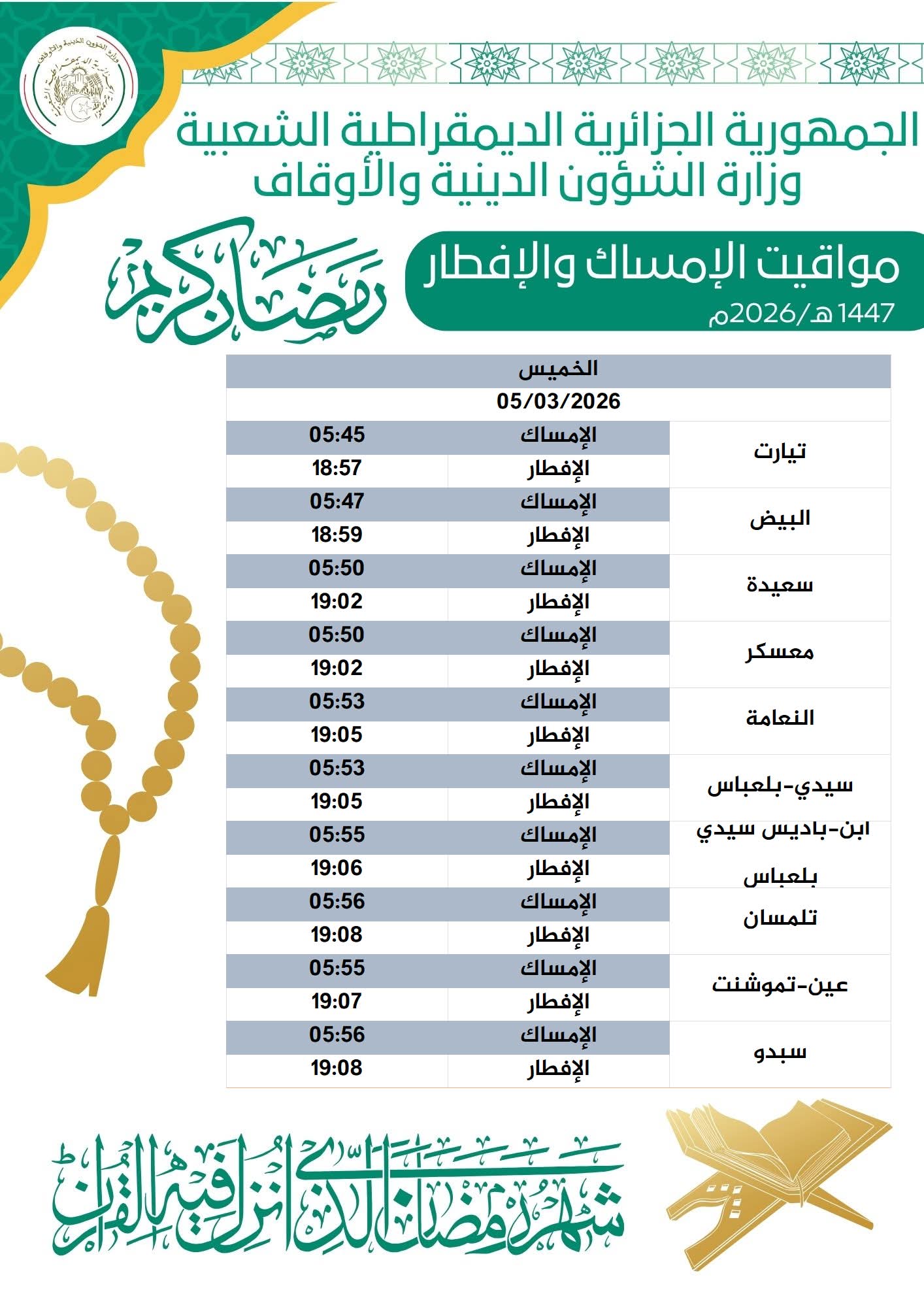 نشرت وزارة الشؤون الدينية والأوقاف مساء الأربعاء، مواقيت الإمساك والإفطار، لجميع ولايات الوطن. في يوم الخميس 15 رمضان 1447ه.