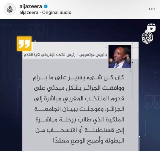 ونقلت قناة “الجزيرة” القطرية على لسان باتريس موتسيبي قوله: “كان كلّ شيء يسير على ما يُرام، ووافقت الجزائر بِشكل مبدئي على قدوم المنتخب المغربي مباشرة إلى الجزائر. وفوجئتُ بِبيان الاتحاد المغربي لِكرة القدم الذي طالب بِرحلة مباشرة إلى قسنطينة أو الانسحاب من البطولة، وأصبح الوضع مُعقّدا”.