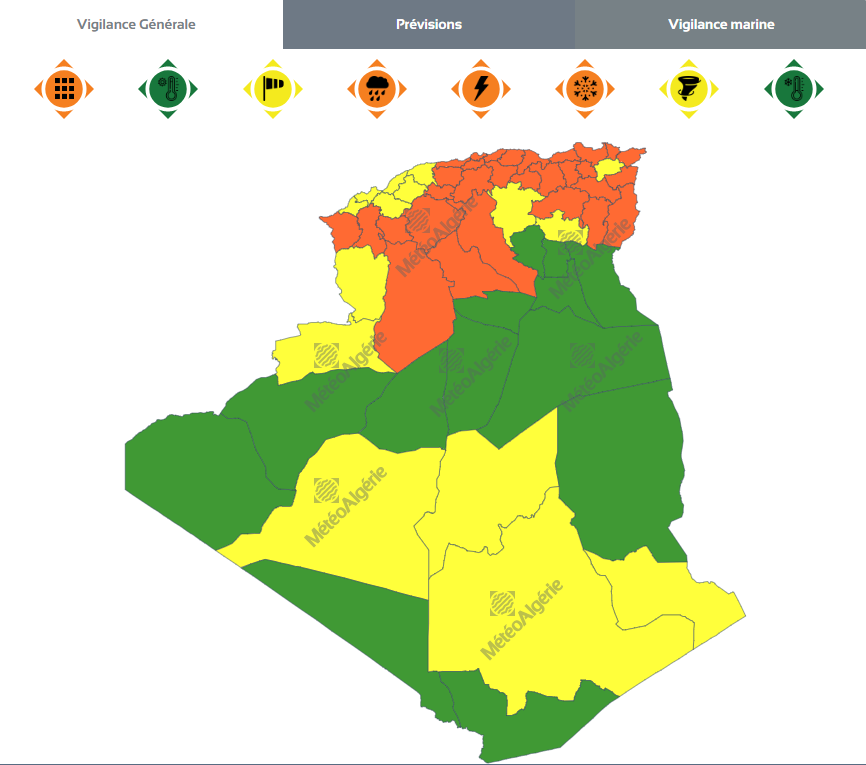 وحسب تنبيه من المستويين الأول والثاني فإن الولايات المعنية بالأمطار هي: تلمسان، سيدي بلعباس، عين تيموشنت، وهران، معسكر، غليزان، مستغانم، الشلف، تيسمسيلت، عين الدفلى، تيبازة، المدية، البليدة، العاصمة، بومرداس، البويرة، تيزي وزو، بجاية، سطيف، ميلة، جيجل، سكيكدة، قسنطينة، قالمة، عنابة، الطارف، سوق أهراس، تبسة.