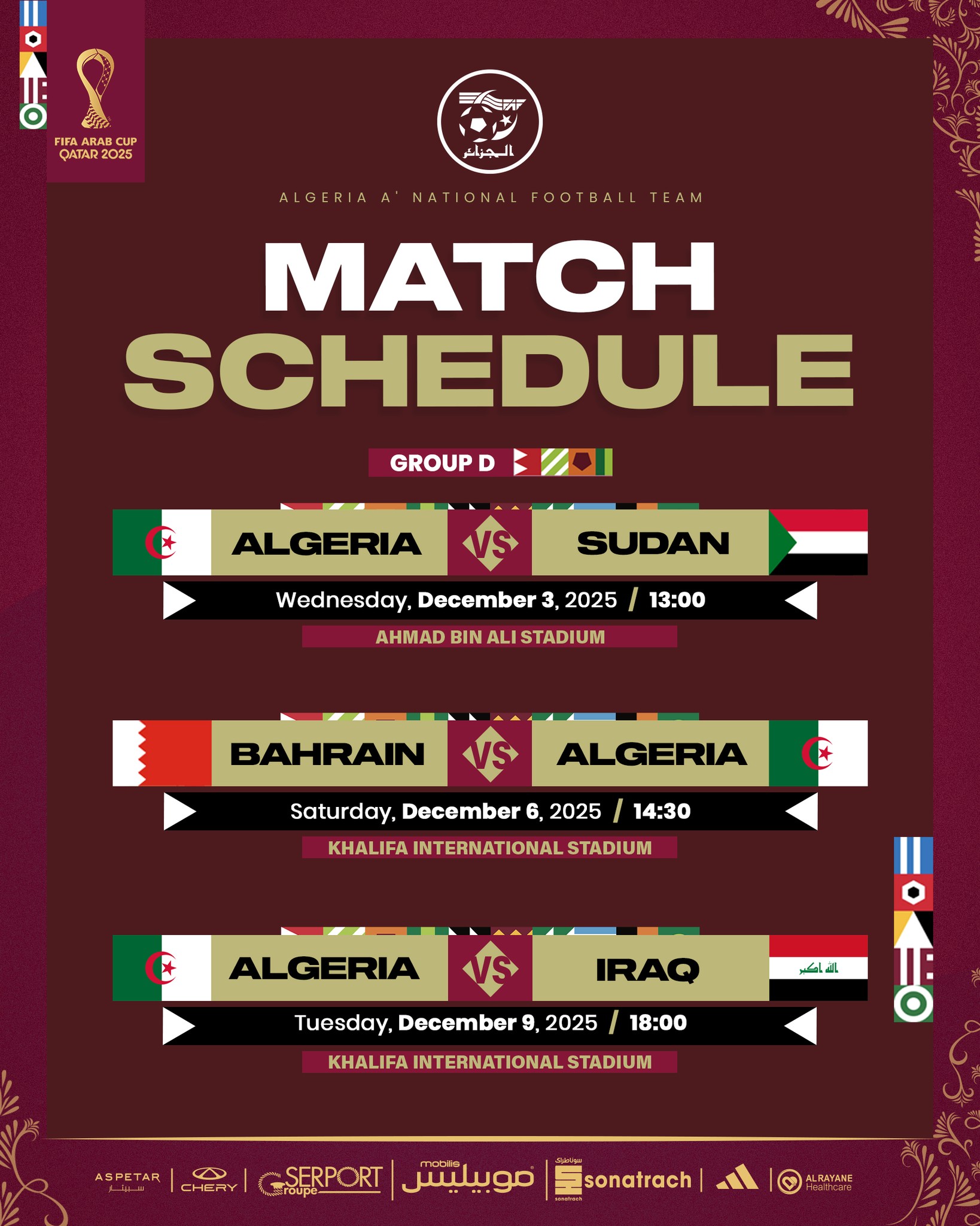 ويواجه المنتخب السوداني، نظيره الجزائري يوم 3 ديسمبر، بداية من الساعة الواحدة ظهرا، بتوقيت الجزائر، لحساب الجولة الأولى من مباريات المجموعة الرابعة.