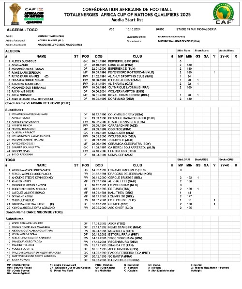 ويحمل الحارس ألكسيس قندوز القميص رقم “1”، مثلما هو الشأن مع ناديه برسبوليس الإيراني. بينما يرتدي المدافع سعدي رضواني القميص رقم “25” للمنتخب الوطني، ورقم “19” مع ناديه اتحاد العاصمة. عِلما أن الثلاثي لاعبون جدد في صفوف أكابر النّخبة الوطنية.