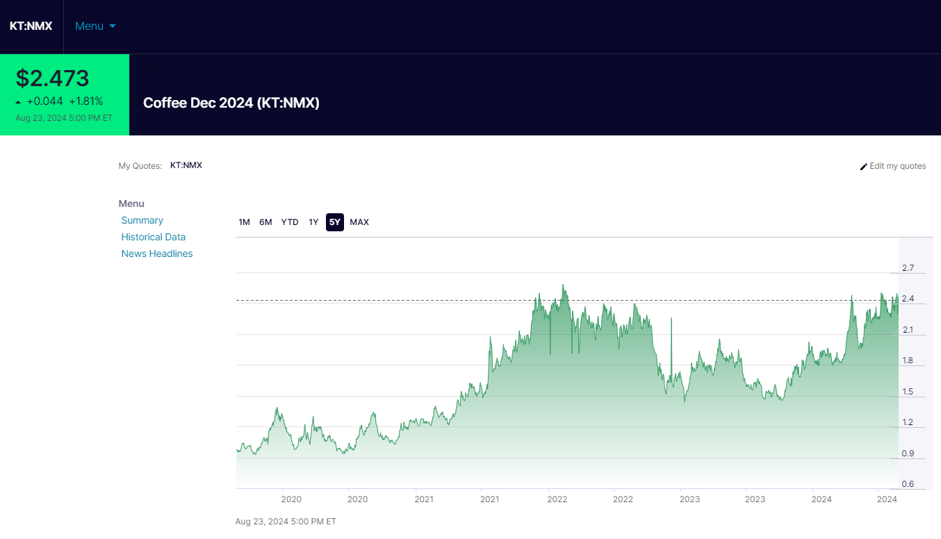 وحسب المؤشرات الصادرة عن ذات البورصة صبيحة اليوم، فان سعر الكيلوغرام الواحد من مادة القهوة، تسليم شهر ديسمبر المقبل، يقدّر بـ 4,9 دولار أمريكي، أي ما يعادل 650 دج، وبزيادة قدرها 1,9 دولار للكيلوغرام، عن نفس الفترة من السنة الماضية 2023، أي بزيادة مئوية قدرها 62 %.