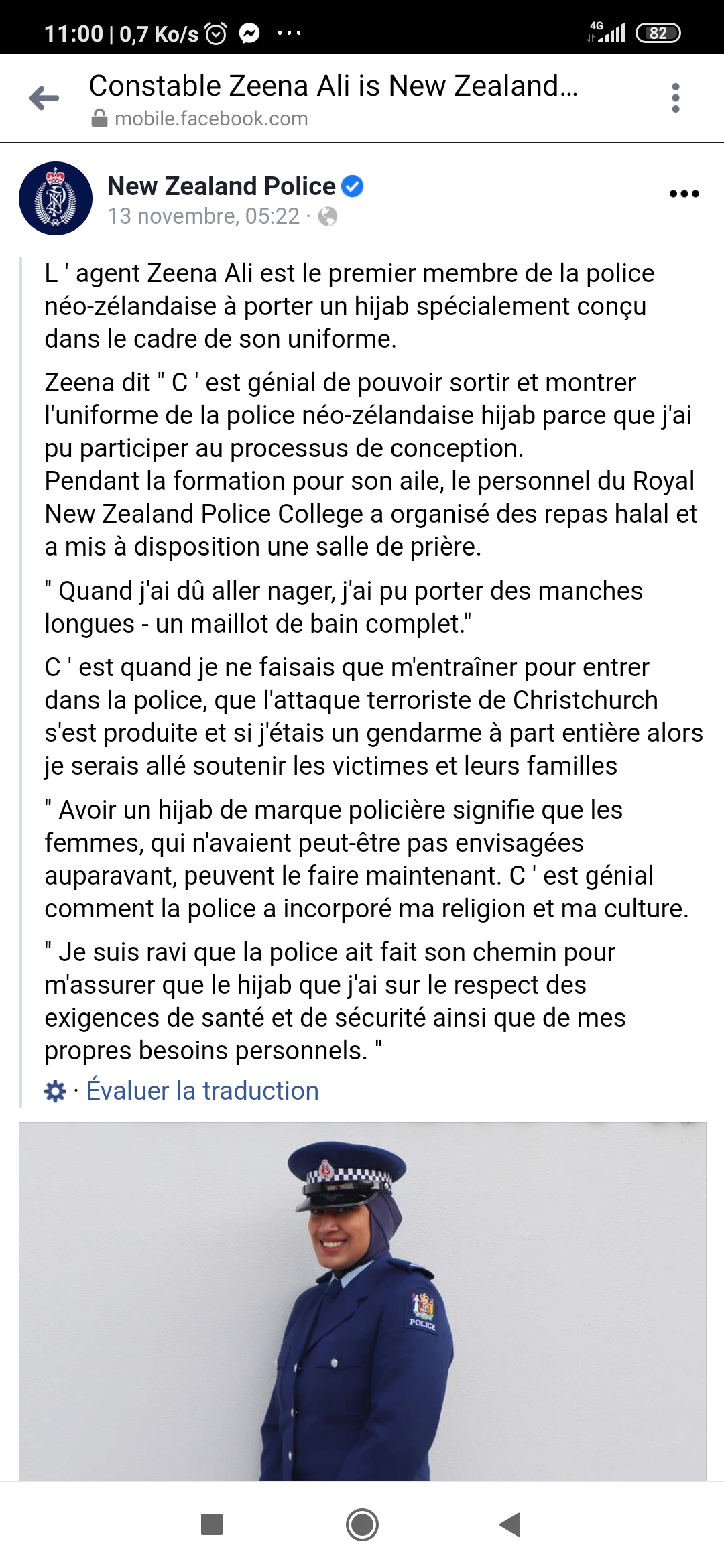 نشرت شرطة نيوزيلندا على حسابها بموقع فيسبوك صورة للشرطية “زينة علي” وهي ترتدي الحجاب كجزء من زيها الرسمي، وهو ما اعتبره متابعون سابقة تعد الأولى في تاريخ البلاد.