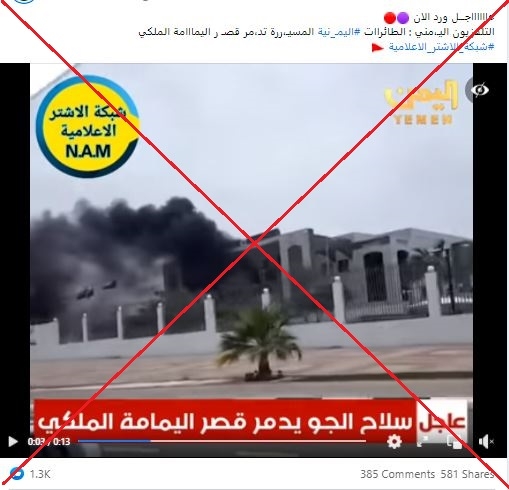 وأوضح فريق تقصي الحقائق لوكالة “فرانس برس” أنّ الفيديو في الحقيقة يظهر حريقاً في مبنى إمارة منطقة جازان عام 2016، والهجمات الأخيرة لم تستهدف “قصر اليمامة” بل منشآت تابعة لشركة آرامكو.