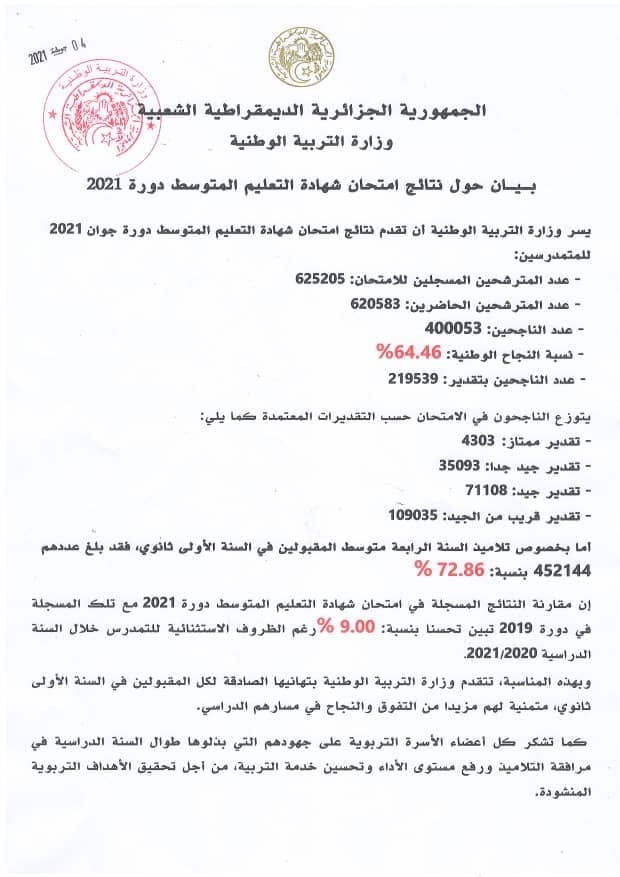 وفي بيان لها أعلنت الوزارة أن نسبة النجاح الوطنية بلغت 64.46 بالمئة، أما بخصوص تلاميذ السنة الرابعة متوسط المقبولين في السنة الأولى ثانوي فقد قدرت النسبة بـ 72.86 بالمئة.