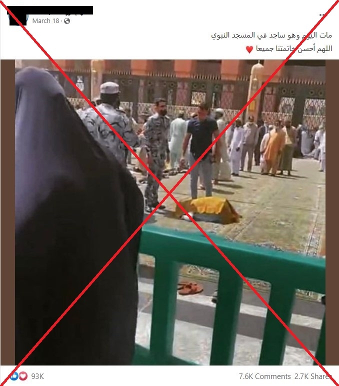 وجاء في التعليق المرافق “مات وهو ساجد في المسجد النبويّ”، وحصدت المنشورات آلاف المشاركات وعشرات آلاف التفاعلات على مواقع التواصل.