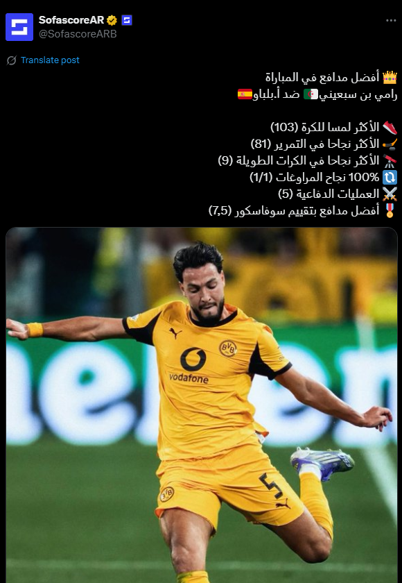 شارك الدولي الجزائري رامي بن سبعيني في الفوز الذي حققه ناديه بوروسيا دورتموند أمام أتلتيك بلباو.