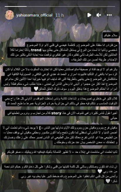 وأضافت: “الحمد لله عندي الوعي الكافي والمسؤولية الكافية كي لا أتكلم عن الموضوع، حتى ينتهي بالطريقة التي يرى الله أن فيها الخير لنا، لكن بما أن الموضوع أخذ أكبر من حجمه وأذاني أنا ومن يحبونني، فأود أن أطلب منكم شيئا، فضلا وليس أمرا وأنا أختكم، أن يُغلق الموضوع اليوم وأن نترك الخلق للخالق”.