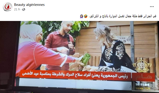 وتساءل نشطاء عن المغزى من هذا المحتوى، وعلقوا على الصور المتداولة: “في الجزائر فقط ملكة جمال تغسل الدوارة بالتاج و الكراكو”.