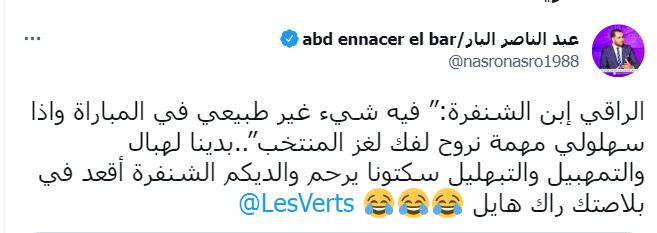 وقال مغردون إن الرقية ضرورية للمنتخب الجزائري الذي تظهر عليه أعراض السحر والعين بشكل مريب، ولكن لا بد من إرسال شيخ ورع ومتمكن، وليس ابن الشنفرة أو رقية أنفسهم بأنفسهم دون الاستعانة به!