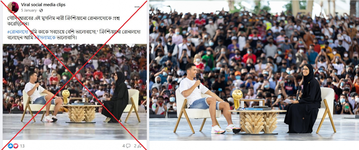 وجاء في منشور باللغة البنغالية تم تداوله على نطاق واسع: “هذه المرأة المسلمة من المملكة العربية السعودية سألت كريستيانو رونالدو: “من تحب أكثر؟” فرد كريستيانو رونالدو: أحب الإسلام.