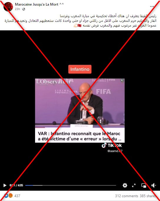 لكن الفيديو المتداول على مواقع التواصل، والذي يتحدّث فيه إنفانتينو عن تقنية حكم الفيديو المساعد (في إيه آر) لا شأن له بمباراة المغرب وفرنسا الأخيرة.