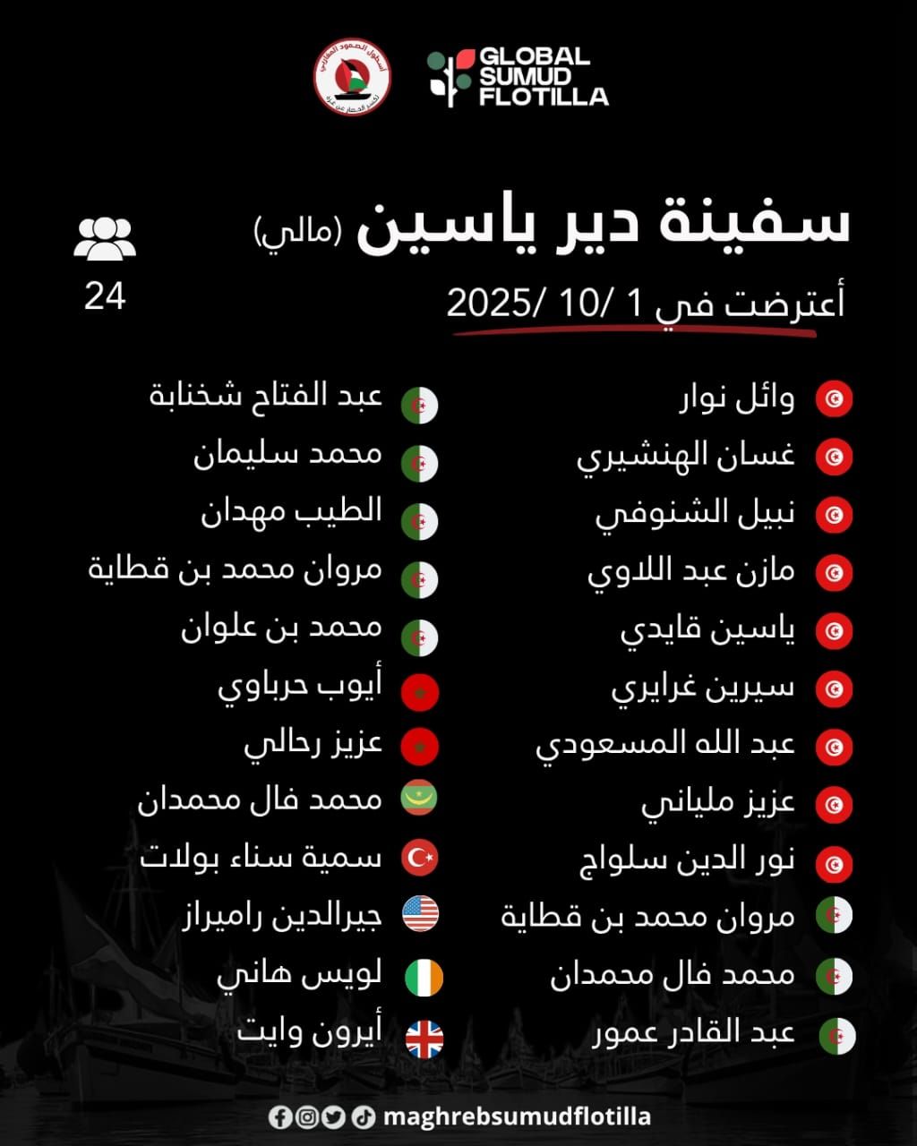 وتضمّ سفينة “دير ياسين”، وهي واحدة من سفن الأسطول المغاربي، 23 مشاركا من عدّة جنسيات. بينهم 7 جزائريين.