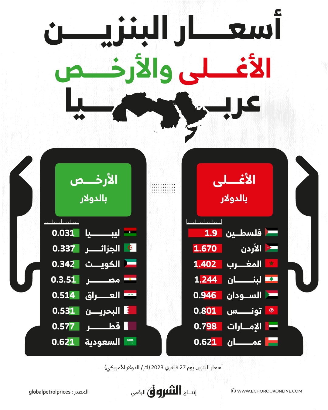في ما يأتي إنفوغراف يظهر تصنيف الدول العربية بحسب سعر البنزين.