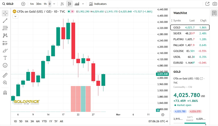 ووفقا لموقع “غولد برايس” و “مجلس الذهب العالمي” فقد بلغ سعر الذهب مستوى 4026 دولارا للأونصة (أوقية) بعد انخفاضات حادّة تعرض لها المعدن الأصفر خلال الأيام الأخيرة، حيث فقد أكثر من 460 دولارا في الاونصة الواحدة.