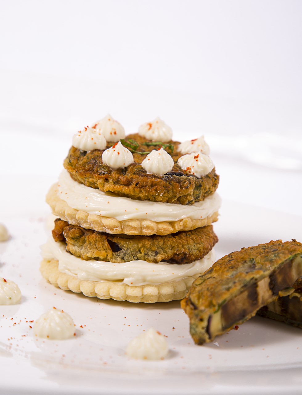 في صحن التقديم، نضع العجينة ثم قليلا من كريمة الجبن ثم قطعة باذنجان ثم الكريمة ثم العجينة ثم الكريمة. وفي الأخير، نضع قطعة باذنجان ونزينها بالكريمة بواسطة كيس حلواني. انظري الصورة.