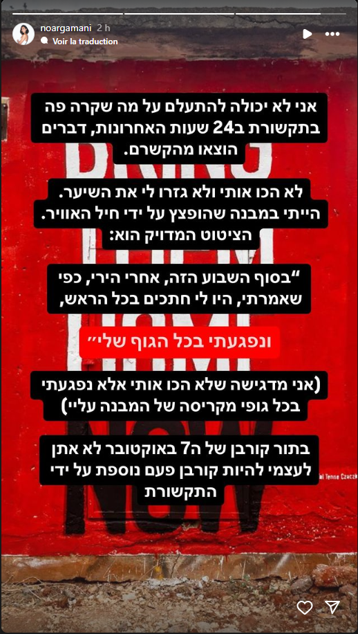 فندت الأسيرة السابقة نوعا أرغماني ما روج له الإعلام العبري حول تعرضها للضرب من طرف عناصر القسام وقالت أن ما حدث معها كان نتيجة انهيار مبنى كانت بداخله.