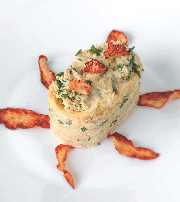 في مقلاة نسخن الزيت ونضع الدجاج المرحي، ثم نضيف الثوم والتوابل ونتركه ينضج على نار هادئة، عندما ينضج نضيف له البقدونس،نأخذ خبز التوست ونقطعه بواسطة قالب تقطيع، ثم نضع فوقه كمية من الدجاج، ثم نضع مرة أخرى خبز التوست، ثم الدجاج، ثم خبز التوست،وفي الأخير نضع الدجاج ونضع فوقه الصلصة (نحضرها مسبقا كالتالي: نخفق صفار البيض ونضيف عصير الليمون والثوم والملح ونواصل الخفق ونضيف الزيت) ونزين باللفت المقلي كما هو موضح في الصورة.