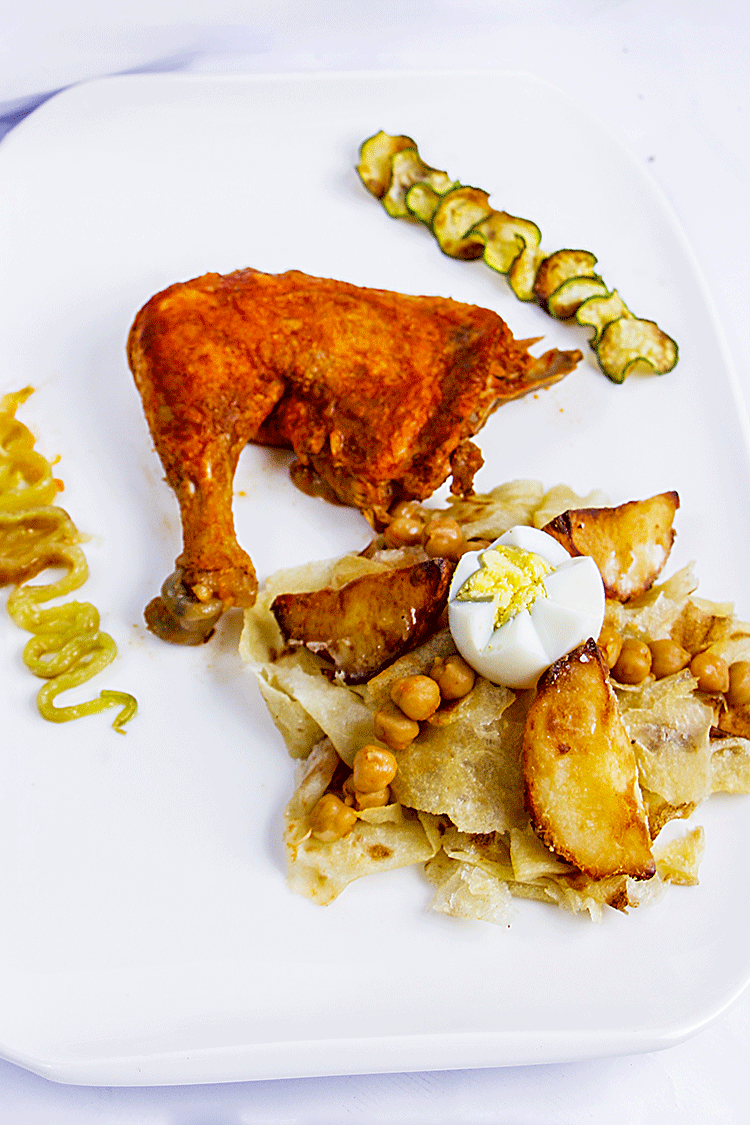 في قدر نسخن الزيت، ثم نضيف الدجاج والبصل والثوم المهروس ونترك المقادير تتقلى جيدا، ثم نضيف التوابل والطماطم المصبرة والحمص،وعندما تتقلى المقادير جيدا نمرق بماء مرق الدجاج، ثم نضيف البطاطا (مقطعة على 4)، وعندما ينضج الدجاج نطفئ النار، بعد ذلك ننزع البطاطا ونحمرها في الزيت، قبل التقديم نأخذ ورق الشخشوخةونقطعه، ثم نقوم بتفويرهونضعهفي صحن التقديم،و نسقي بالمرق و نزين بالقرعة والبطاطا و الفلفل الحار والحمص والبيض المسلوق (أنظري الصورة).