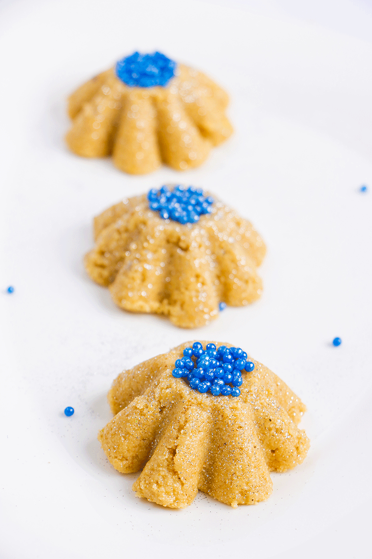 نقوم بتشكيل العجينة على شكل كريات وبواسطة النقاش نقوم بتزيينها، ثم نغمسها في السكر ونزينها بكريات خضراء كما هو موضح في الصورة.