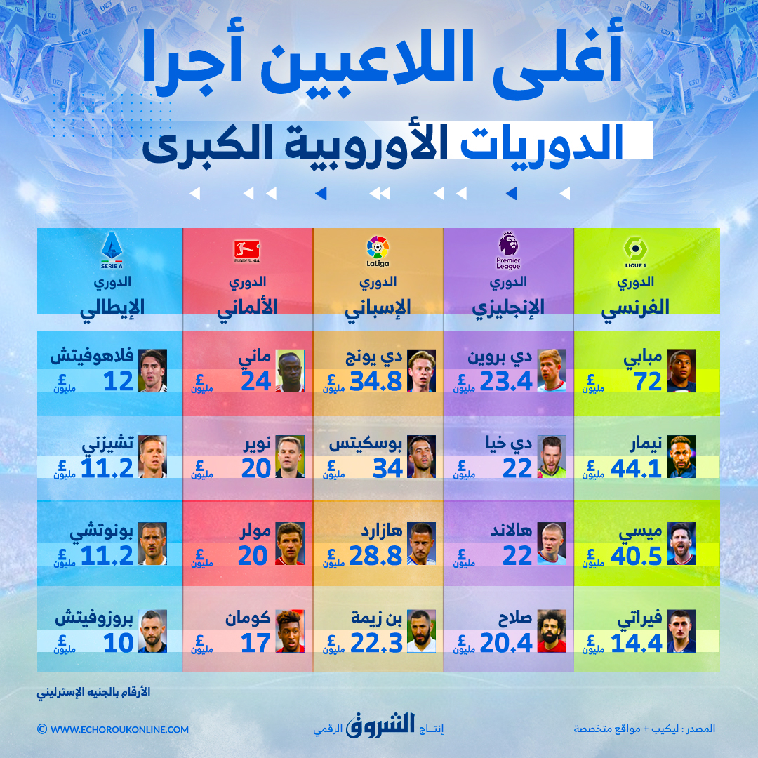 أغلى اللاعبين أجرا في الدوريات الأوروبية الكبرى