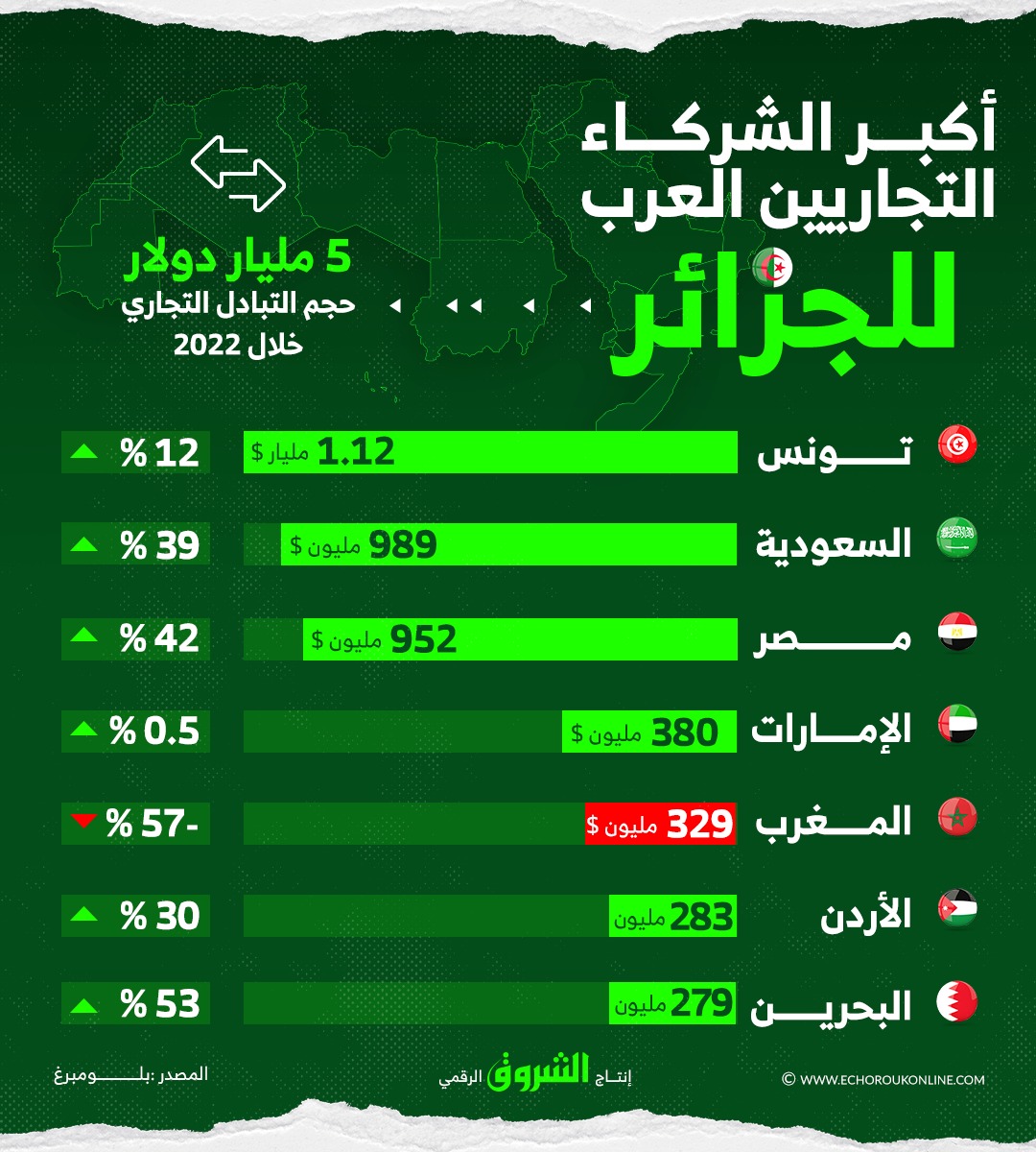 بلغت قيمة التبادلات التجارية للجزائر مع الدول العربية 5 مليارات دولار في عام 2022.. تعرف من خلال الإنفوجراف على أكبر الشركاء