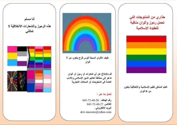 – كل الألعاب والأدوات المدرسية التي تحمل 6 ألوان وهي الأحمر، البرتقالي، الأصفر، الأخضر، الأزرق، البنفسجي، لأنها تعتبر شعار المثليين.