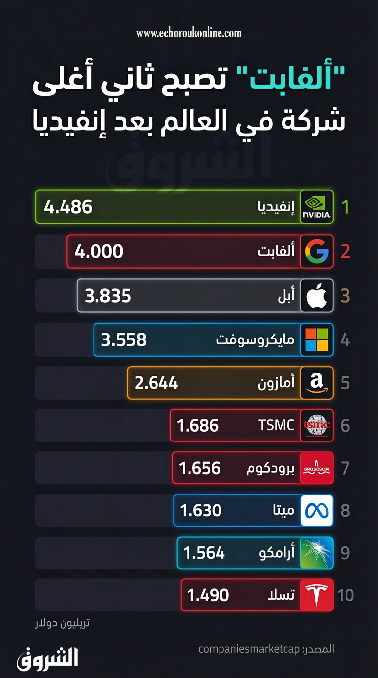 وبوصولها إلى هذا المستوى، تحتل ألفابت المركز الثاني عالميًا ضمن قائمة أكبر الشركات من حيث القيمة السوقية، خلف شركة إنفيديا التي تتصدر الترتيب بقيمة سوقية تبلغ 4.486 تريليون دولار بحسب بيانات موقع companiesmarketcap.
