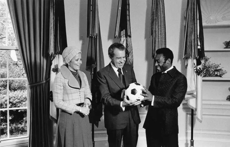 وتُظهر الصورة المُدرجة أدناه الرئيس الأمريكي ريتشارد نيكسون (1969-1974) بِمكتبه في “البيت الأبيض”، رفقة بيليه.