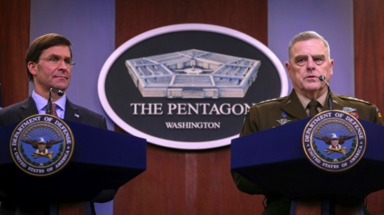 وزير الدفاع الأمريكي مارك إسبر ورئيس أركان الجيوش الأمريكية مارك مايلي في مؤتمر صحفي في مقر وزارة الدفاع الأمريكية (البنتاغون) يوم 20 ديسمبر 2019