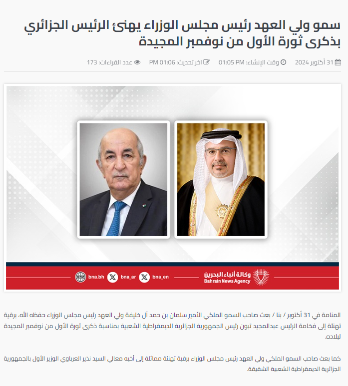 بعث أمير البحرين، سلمان بن حمد آل خليفة ولي العهد رئيس مجلس الوزراء، الخميس، ببرقية تهنئة إلى رئيس الجمهورية عبد المجيد تبون، بمناسبة ذكرى ثورة الأول من نوفمبر المجيدة.