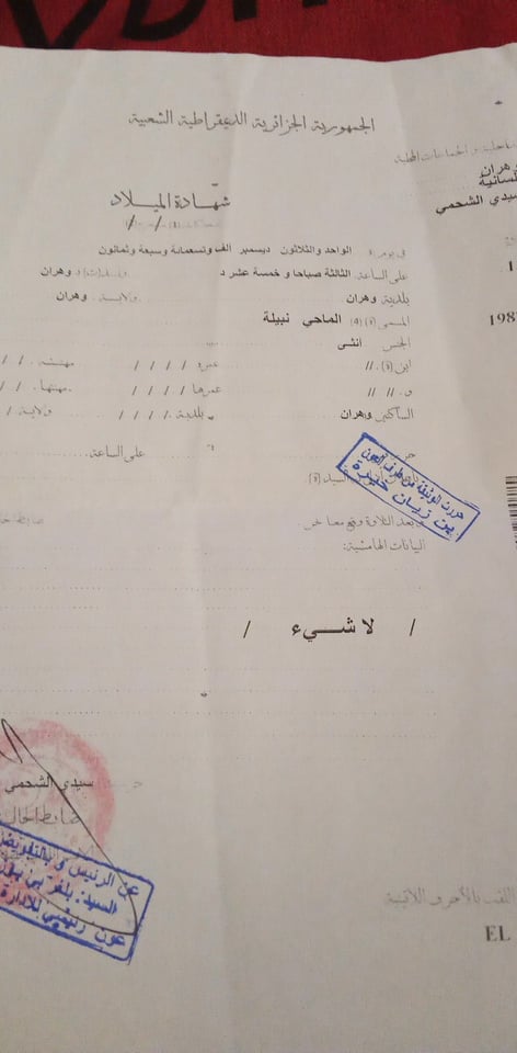 توفيق نبيلة، من مواليد من 31 .12. 1987 بوهران، تأكد لي أن هذا الاسم هو الذي منحته لي السلطات الجزائرية.