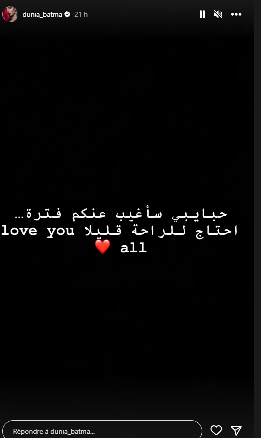 ونشرت بطمة عبر خاصية “الستوري” على “إنستغرام” تدوينة قالت فيها: “حبايبي سأغيب عنكم فترة.. أحتاج للراحة قليلًا.. أحبكم جميعًا”.