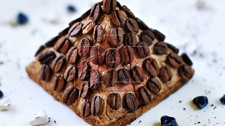 في وعاءنخفق “الشانتيي” مع القهوة الباردة، وفي وعاء آخر نضع القشدة ونضيف لها  الشكولاطة ثمورقة “الجيلاتين” المنقوعة في الماء البارد،  نخلط “الشانتيي” المخفوقة مع خليط الشكولاطةوالمكسرات حتى نتحصل على كريمة، في قوالب على شكل أهرامات نضع ورق الشفاف ثم نفرغ كمية من الكريمة ونغطيها بقطعة من البسكويت المقطع مربعات، نرشها بشراب القهوة، ثم ندخلها الثلاجة لمدة 4 ساعات أو أكثر، بعد إخراجها ننزعها من القوالب ونزينها بحبات القهوة ونقدمها.
