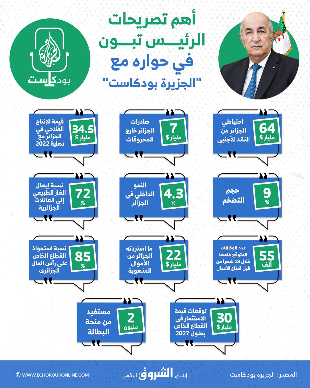 أهم تصريحات رئيس الجمهورية عبد المجيد تبون في حواره مع الجزيرة بودكاست: