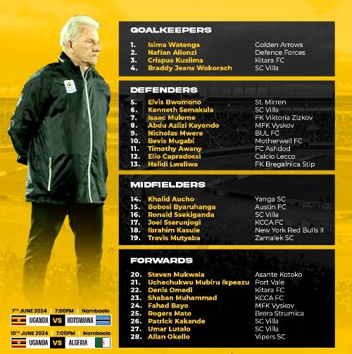 كشف اتحاد أوغندا لكرة القدم، الخميس، عن قائمة لاعبي منتخب بلاده، استعداد لِخوض مقابلتَين رسميتَين إحداهما أمام الجزائر.