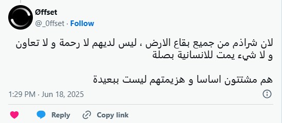 وقال صالح محمد: “علت أصواتنا ونحن نقول للعالم أنهم عنصريون.. فهل صدقتم الآن ما كنا نرفع أصواتنا به؟”، فيما كتب آخر: “لأنهم شراذم من جميع بقاع الارض، ليس لديهم لا رحمة ولا تعاون ولا شيءيمت للإنسانية بصلة”، تابع تعليقه:”هم مشتتون أساسا وهزيمتهم ليست ببعيدة”.