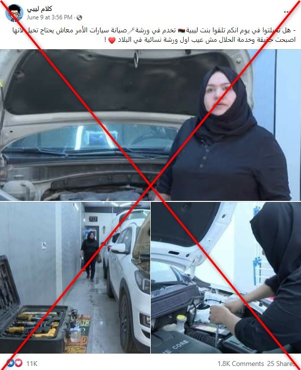 يتضمّن المنشور ثلاث صور لسيّدة تصلح السيّارات، وجاء في التعليق المرافق “هل تخيلتم أن تلتقوا يوماً فتاة ليبيّة تخدم في ورشة لصيانة سيارات… الأمر أصبح حقيقة…أول ورشة نسائية في البلاد!”.
