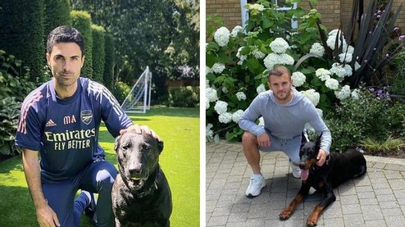 وتُظهر الصورة المُدرجة أعلاه كلّ مِن ميكل أرتيتا (من اليسار) وجاك ولشير، رفقة كلبَيهما للحراسة.
