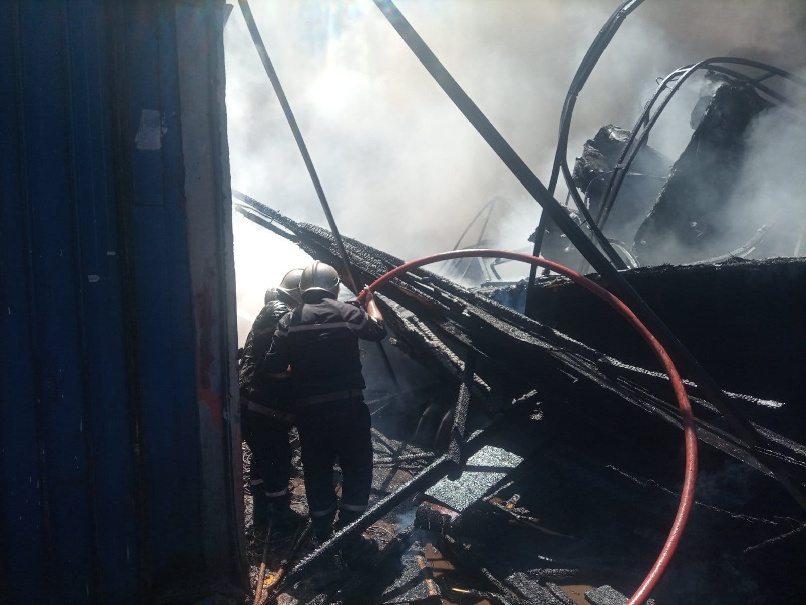 إخماد حريق نشب بورشة لتصليح قوارب الصيد في ميناء زموري البحري (صور)