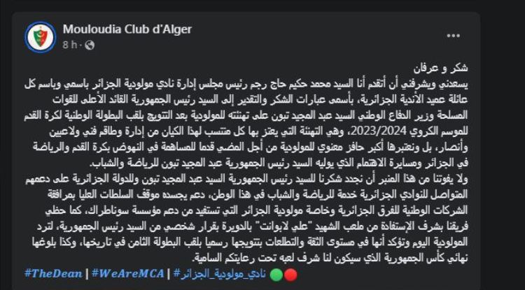 قدّمت إدارة نادي مولودية الجزائر، السبت، تشكّراتها إلى رئيس الجمهورية عبد المجيد تبون. بعد تتويج الفريق بِلقب البطولة الوطنية لِكرة القدم.