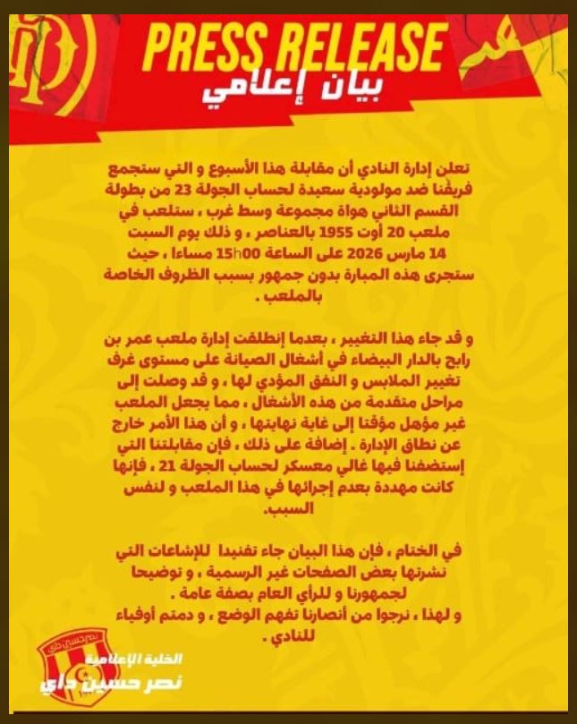 نشرت إدارة نادي نصر حسين داي، الإثنين، بيانا موجّها إلى أنصار فريقها لكرة القدم.