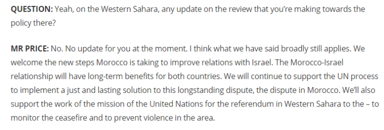 جاء هذا على لسان المتحدث باسم الخارجية الأمريكية، نيد برايس، خلال الإفادة الصحفية اليومية للخارجية في واشنطن، رداً على سؤال حول أي تحديث بشأن المراجعة التي تجريها إدارة بايدن بخصوص الصحراء الغربية.