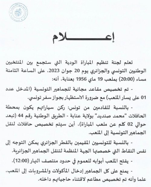 وجّهت إدارة ملعب “19 ماي 1956” بِعنابة نداءً إلى أنصار منتخب تونس لِكرة القدم.