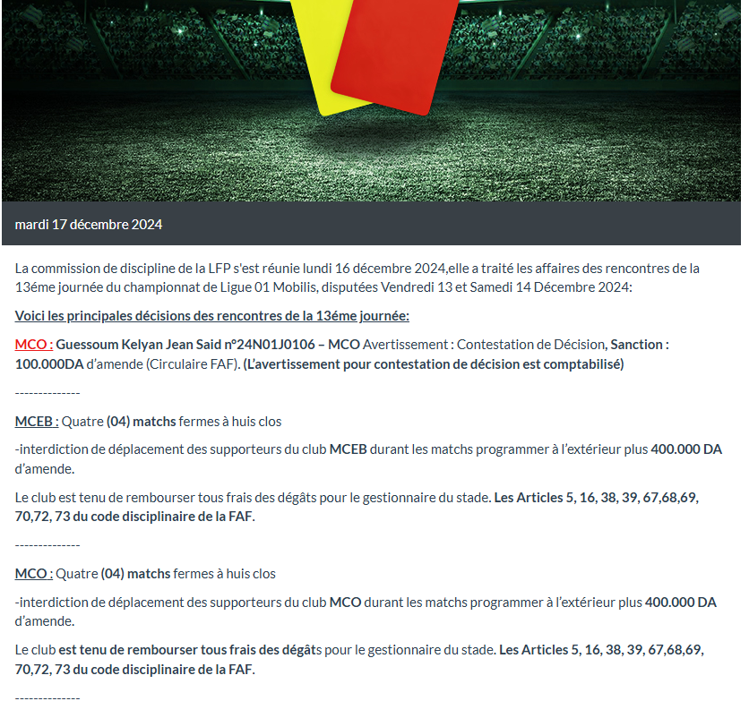 لجنة الانضباط تصدر عقوباتها بخصوص مباراة مولودية البيض ومولودية وهران