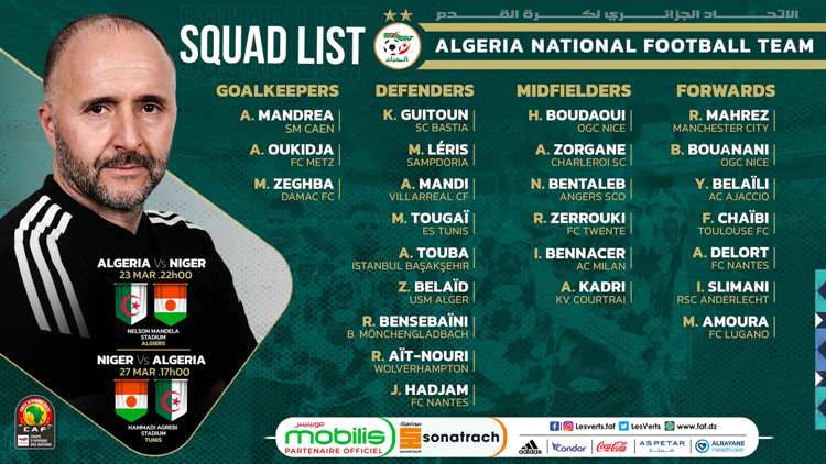 وكان الناخب الوطني الجزائري جمال بلماضي، الجمعة، قد كشف عن قائمة تضمّ 25 لاعبا استعدادا لِهاتَين المقابلتَين. وقد خلت من اسم المدافع بدران.