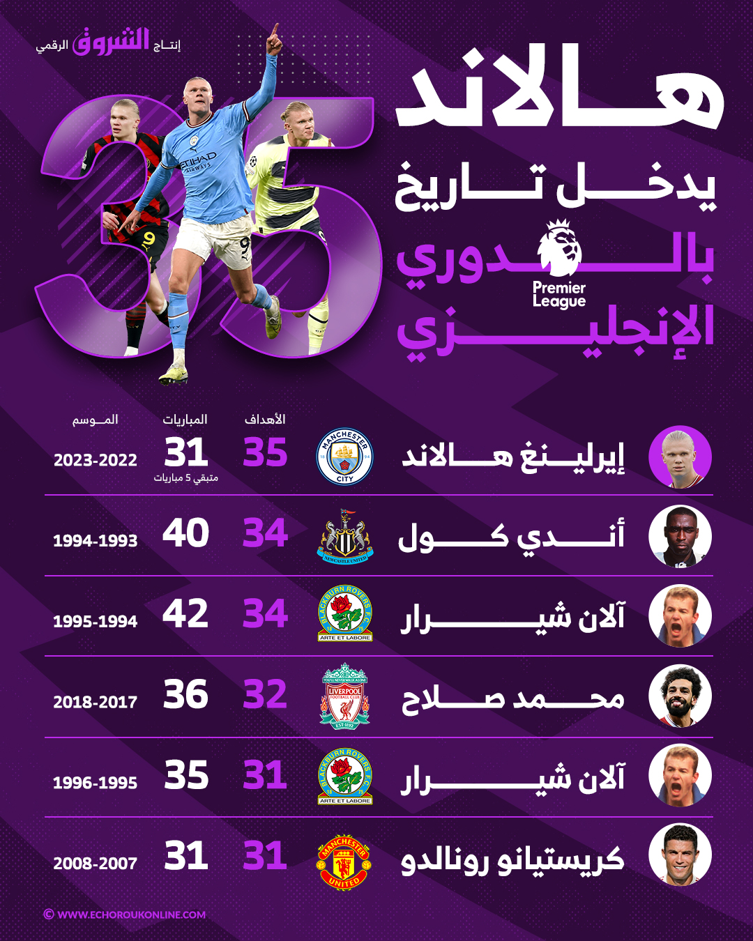 سجل 35 هدفا قبل 5 جولات من نهاية الموسم.. إرلينغ هالاند يدخل تاريخ الدوري الإنجليزي الممتاز